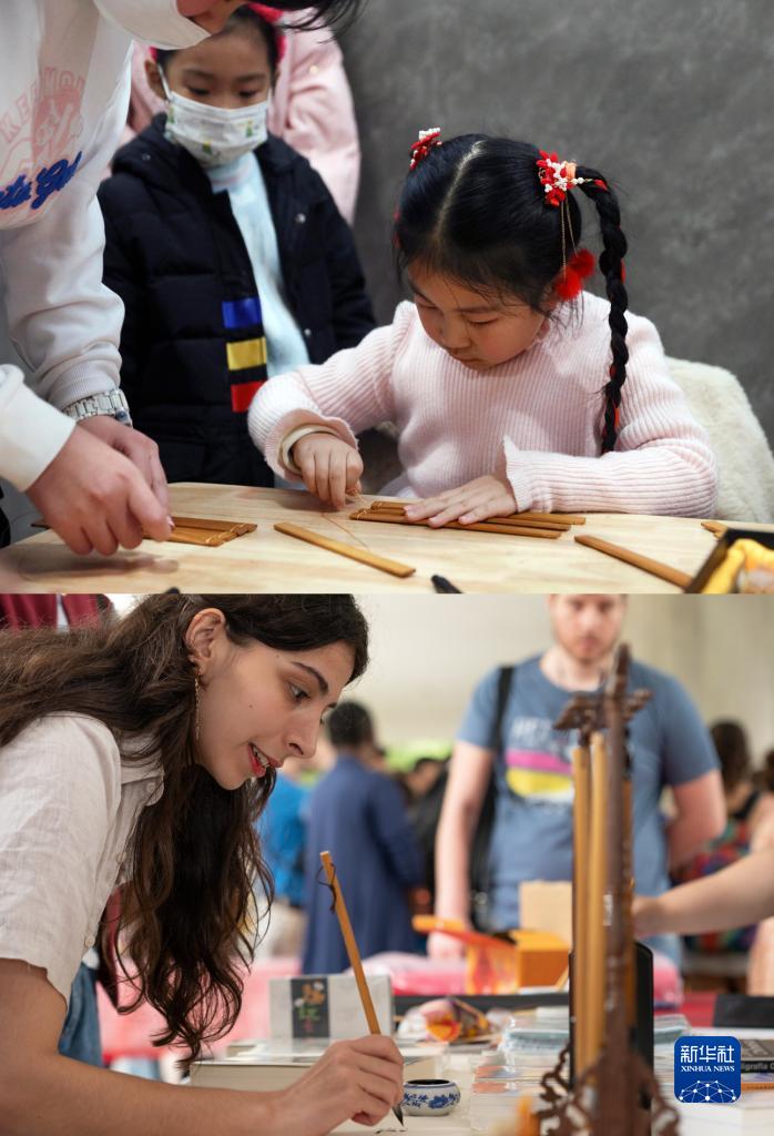 拼版照片:上圖為2023年2月4日,小朋友在位于河南安陽(yáng)的中國文字博物館體驗竹簡(jiǎn)制作(新華社記者 蘭紅光 攝);下圖為2023年4月19日,在巴西里約熱內盧,一名參觀(guān)者在聯(lián)合國中文日活動(dòng)上體驗中國書(shū)法(新華社記者 王天聰 攝)。