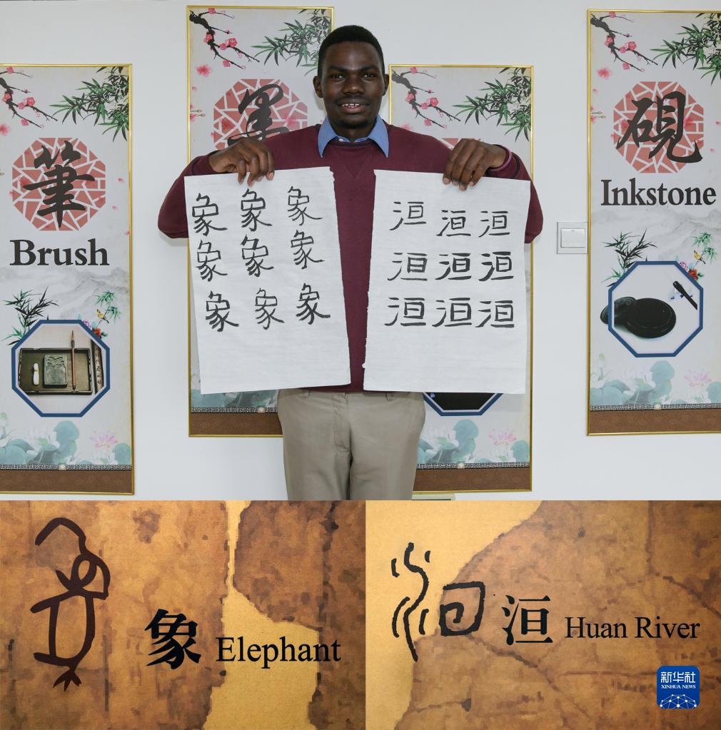 拼版照片:上圖為2023年4月17日,阿瓜塔·阿莫斯·米奇拉在肯尼亞內羅畢大學(xué)孔子學(xué)院展示他用毛筆書(shū)寫(xiě)的“象”和“洹”字(新華社記者 韓旭 攝);下左圖為2023年4月19日在位于中國河南省安陽(yáng)市的中國文字博物館拍攝的“象”字甲骨文(左);下右圖為2023年4月19日在位于中國河南省安陽(yáng)市的中國文字博物館拍攝的“洹”字甲骨文(左)(新華社記者 李安 攝)。