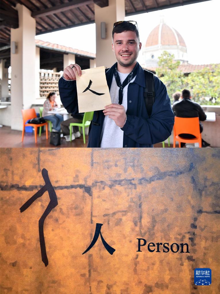 拼版照片:上圖為2023年4月13日,在意大利佛羅倫薩大學(xué)孔子學(xué)院舉辦的學(xué)寫(xiě)漢字活動(dòng)上,菲利波展示他學(xué)習書(shū)寫(xiě)的漢字“人”(新華社記者 金馬夢(mèng)妮 攝);下圖為2023年4月19日在位于中國河南省安陽(yáng)市的中國文字博物館拍攝的“人”字甲骨文(左)(新華社記者 李安 攝)。