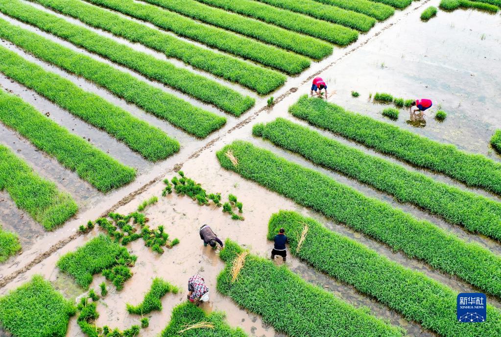 4月20日, 四川省廣安市岳池縣中和鎮太陽(yáng)坪村的農民在秧母田移栽秧苗(無(wú)人機照片) 。