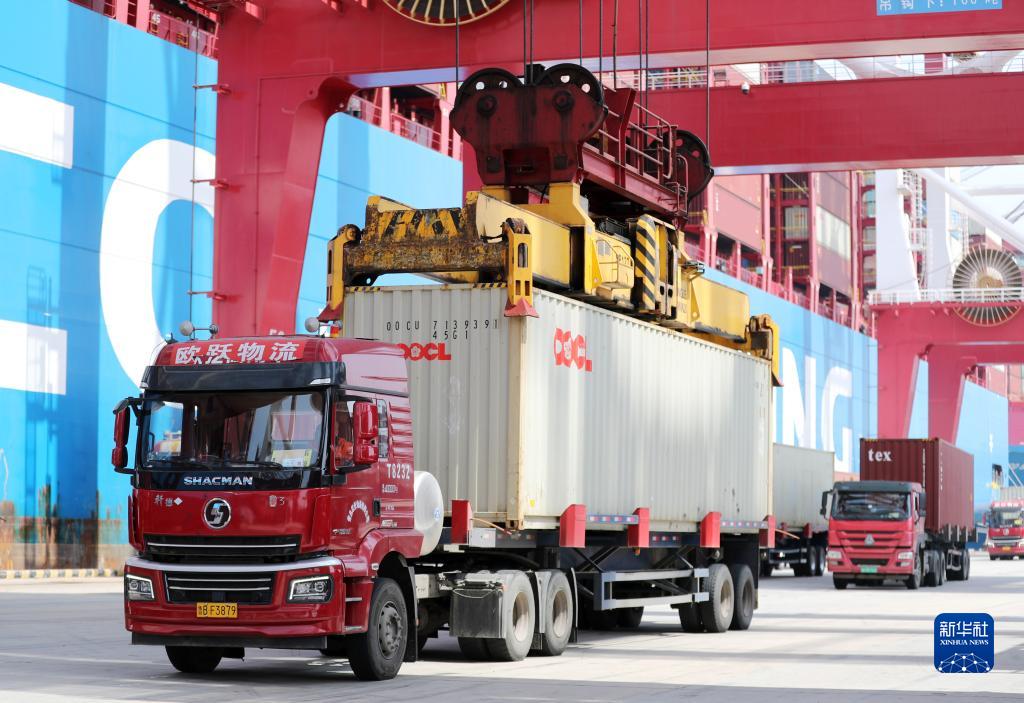 4月20日,在山東港口青島港前灣聯(lián)合集裝箱碼頭,一艘貨輪在裝載貨物。