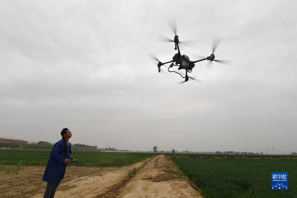 4月20日,張戰強操作植保無(wú)人機開(kāi)展麥管作業(yè)。