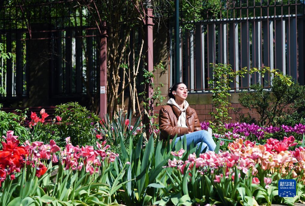 4月20日,在美國紐約的一處花園,一名女子在盛開(kāi)的郁金香附近休憩。
