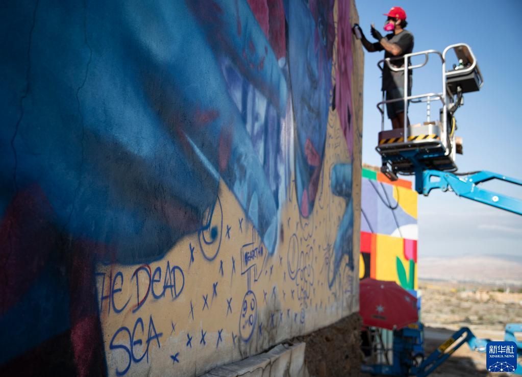 4月20日,藝術(shù)家在死海西岸的廢棄房屋外墻上創(chuàng )作“關(guān)注死?!敝黝}畫(huà)作。