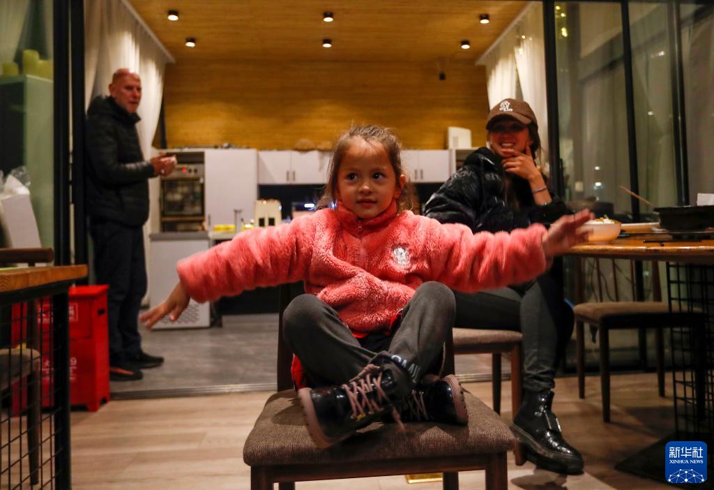 阿明和妻子黃瓊觀(guān)看女兒阿琳娜(中)為民宿客人表演節目(3月23日攝)。