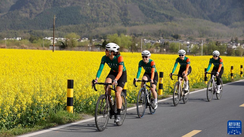 謝敏儀(左一)和隊友在黟縣鄉間道路上進(jìn)行騎行練習(3月26日攝)。