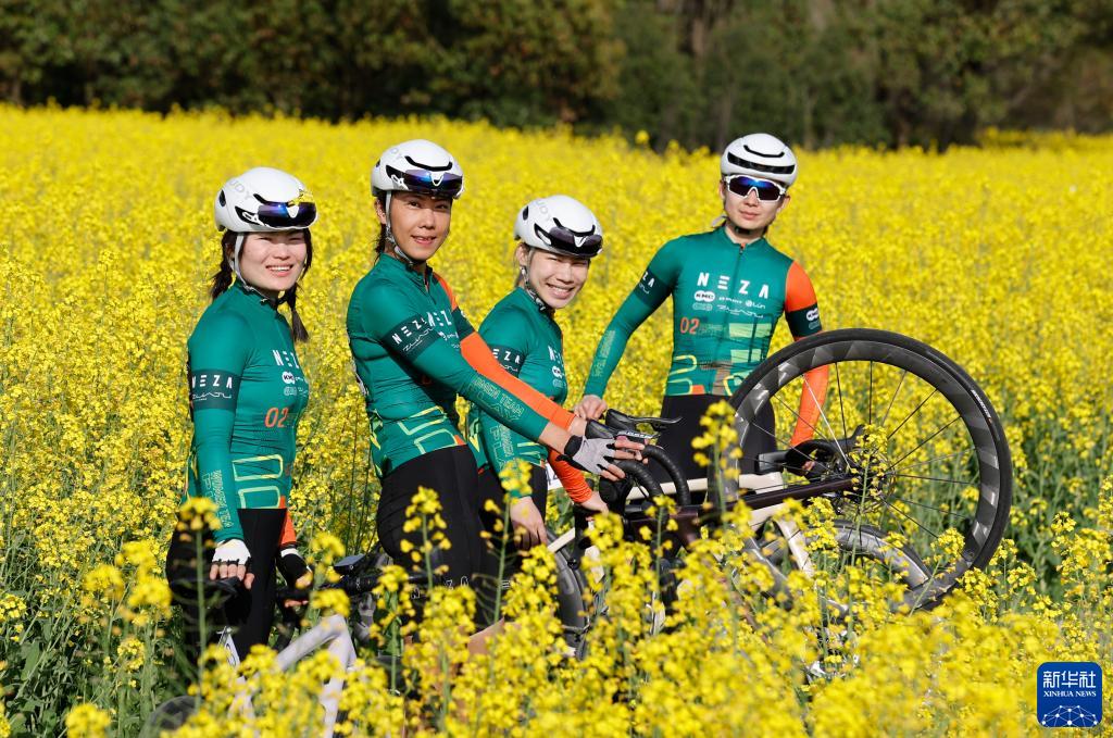 謝敏儀(左二)和隊友在黟縣油菜花田間合影(3月26日攝)。