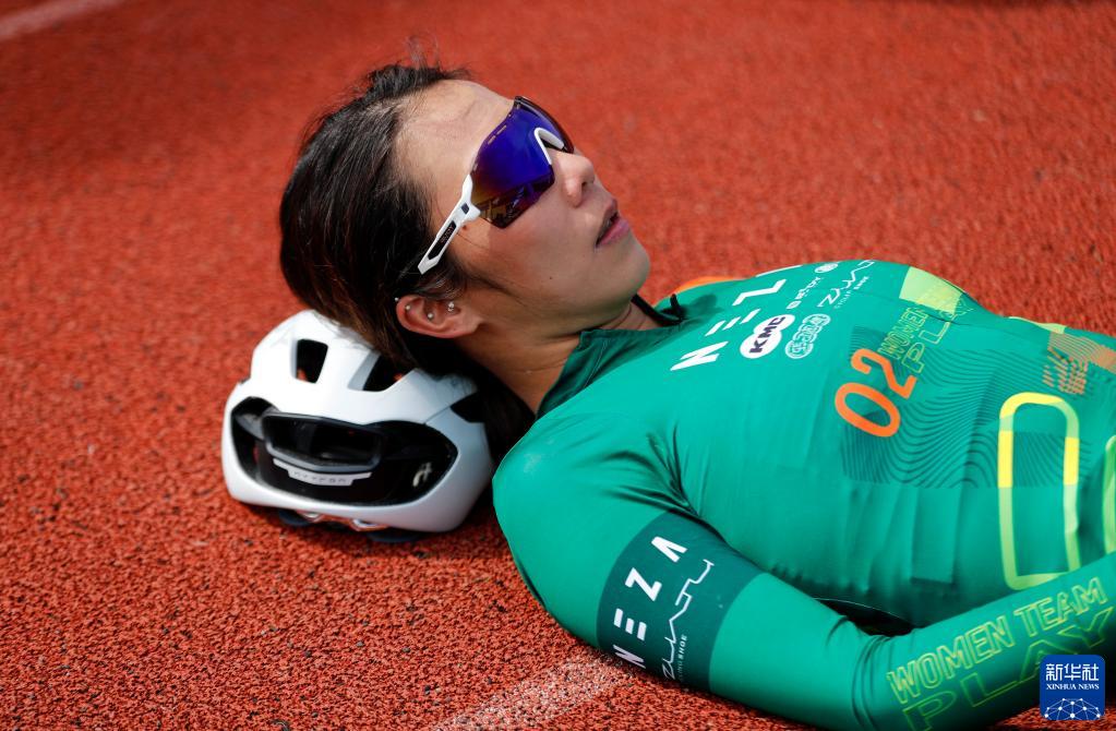 謝敏儀在女子公路自行車(chē)精英組比賽后枕著(zhù)頭盔休息(3月26日攝)。