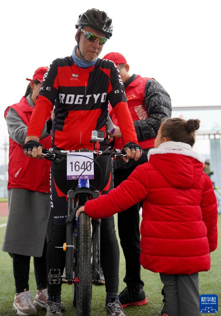 阿明(前左)在女兒阿琳娜陪伴下進(jìn)行2023中國黃山(黟縣)國際自行車(chē)公開(kāi)賽賽前檢錄(3月25日攝)。