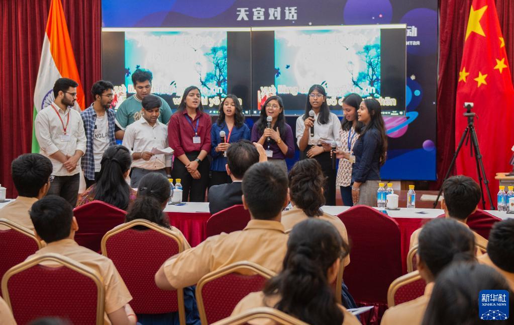 4月20日,印度青少年在位于新德里的中國駐印度大使館參加天宮對話(huà)——神舟十五號航天員乘組與上海合作組織國家青少年問(wèn)答活動(dòng)時(shí)唱歌。