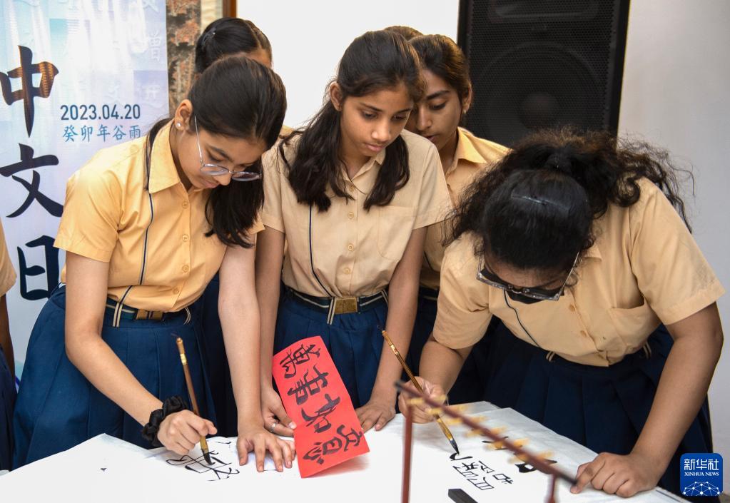 4月20日,印度青少年在位于新德里的中國駐印度大使館參加天宮對話(huà)——神舟十五號航天員乘組與上海合作組織國家青少年問(wèn)答活動(dòng)時(shí)書(shū)寫(xiě)中文。