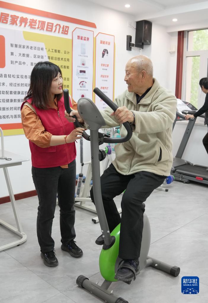 4月21日,秦皇島市北戴河區安居社區日間照料服務(wù)中心的志愿者協(xié)助老人開(kāi)展健身活動(dòng)。