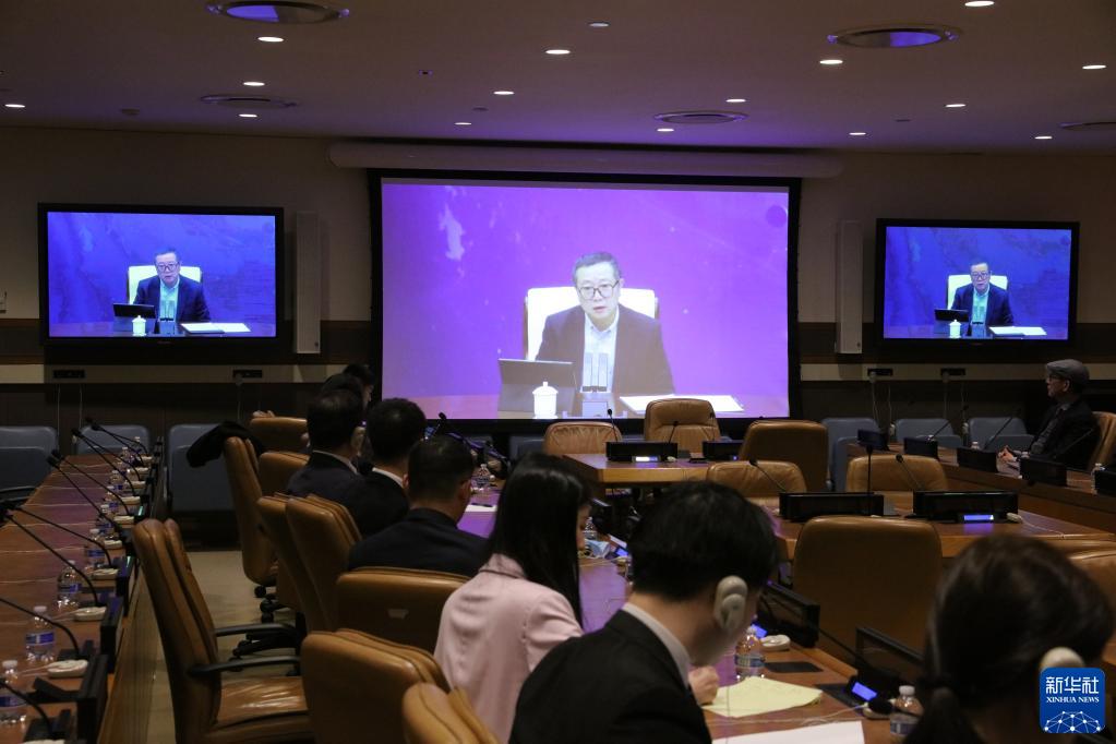 4月20日,在位于紐約的聯(lián)合國總部,中國科幻作家劉慈欣(屏幕)以視頻方式出席聯(lián)合國中文日“科幻文學(xué)與可持續未來(lái)”交流會(huì )。