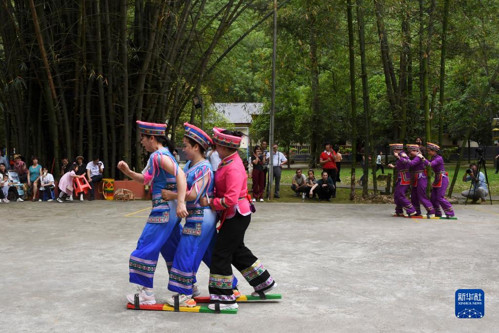 4月21日,在羅城縣米椎林景區,人們參加板鞋競技比賽。