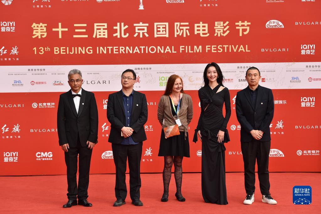 4月21日,本屆電影節“注目未來(lái)”單元評審團成員萬(wàn)瑪才旦 (左一)、科琳娜·博普(中)、李淼(右一)、齊溪(右二)和深田晃司在紅毯儀式上。新華社記者 陳鐘昊 攝