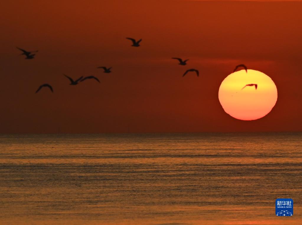這是4月17日在科威特哈瓦利省拍攝的海上日出景色。