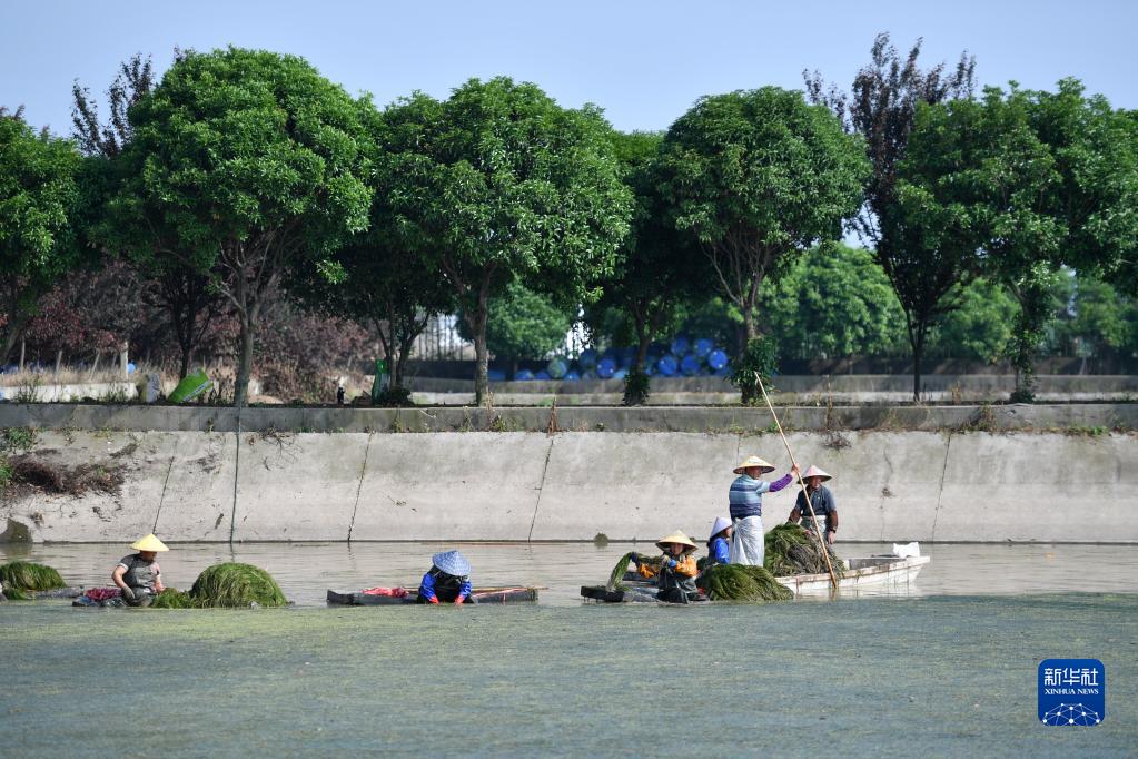 4月20日,工人在大通湖水生植物產(chǎn)業(yè)示范園內采收水草。