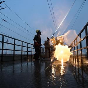 青藏鐵路從青海省海西蒙古族藏族自治州的察爾汗鹽湖橫穿而過(guò),這一段約33公里的線(xiàn)路被稱(chēng)為“萬(wàn)丈鹽橋”。春季大風(fēng)不僅揚沙,還會(huì )揚起察爾汗鹽湖的鹽,鹽污會(huì )在接觸網(wǎng)絕緣子表面附著(zhù),降低絕緣子的爬電距離,遇到雨雪天氣放電,造成接觸網(wǎng)大面積跳閘,影響青藏鐵路正常行車(chē)。近年來(lái),西寧供電段加大科技投入,清洗方式由原來(lái)的使用抹布、噴水壺、小型清洗機轉變?yōu)楦邏核畼專(zhuān)行嵘鳂I(yè)效率。