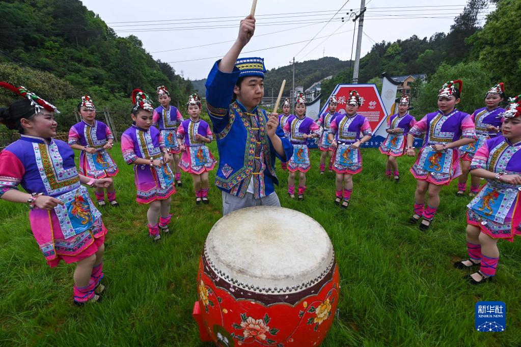 4月22日在團結村“三月三”旅游文化周上拍攝的踩鼓舞表演。
