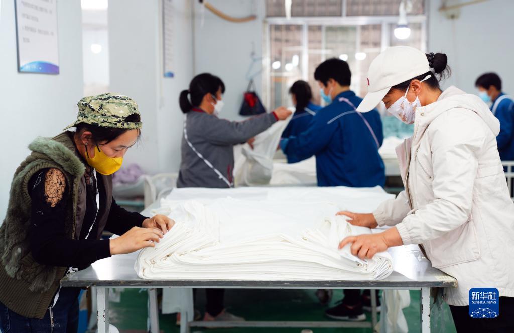 4月22日,在惠民縣胡集鎮“惠民工坊”,工作人員在整理紡織產(chǎn)品上的線(xiàn)頭。