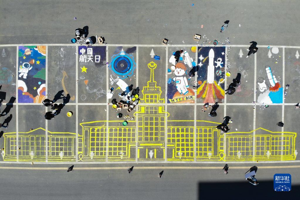 4月22日,在哈爾濱工業(yè)大學(xué)校園,學(xué)生在進(jìn)行航天主題的大地彩繪(無(wú)人機照片)。