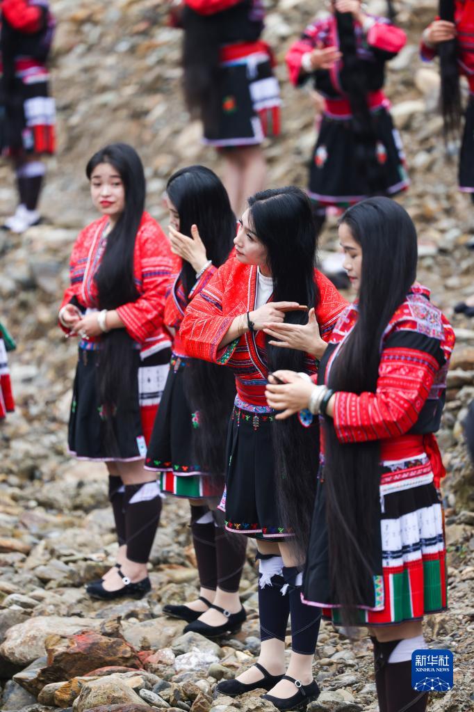 當日是農歷三月初三,廣西桂林市龍勝各族自治縣黃洛瑤寨舉行“三月三龍脊長(cháng)發(fā)節”活動(dòng),吸引游客前來(lái)參觀(guān)游覽。黃洛瑤寨的紅瑤族婦女有世代相傳的蓄發(fā)習俗,平均頭發(fā)長(cháng)度達1.7米,最長(cháng)的有2.72米。