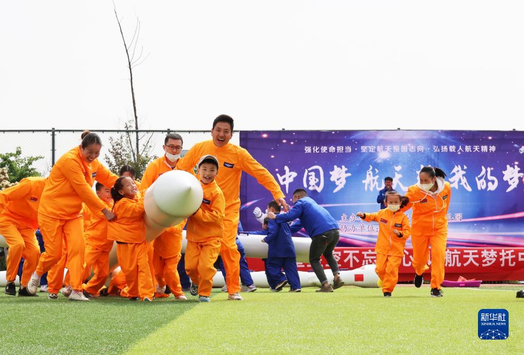 4月22日,在江蘇省連云港市海州區體育場(chǎng),小朋友和家長(cháng)參加航天主題親子游戲。