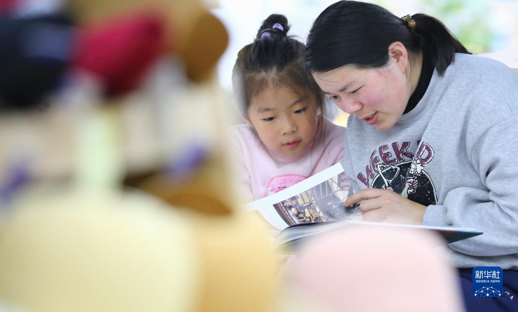 4月22日,在山東省滕州市善讀善品讀書(shū)社,家長(cháng)和孩子在閱讀。