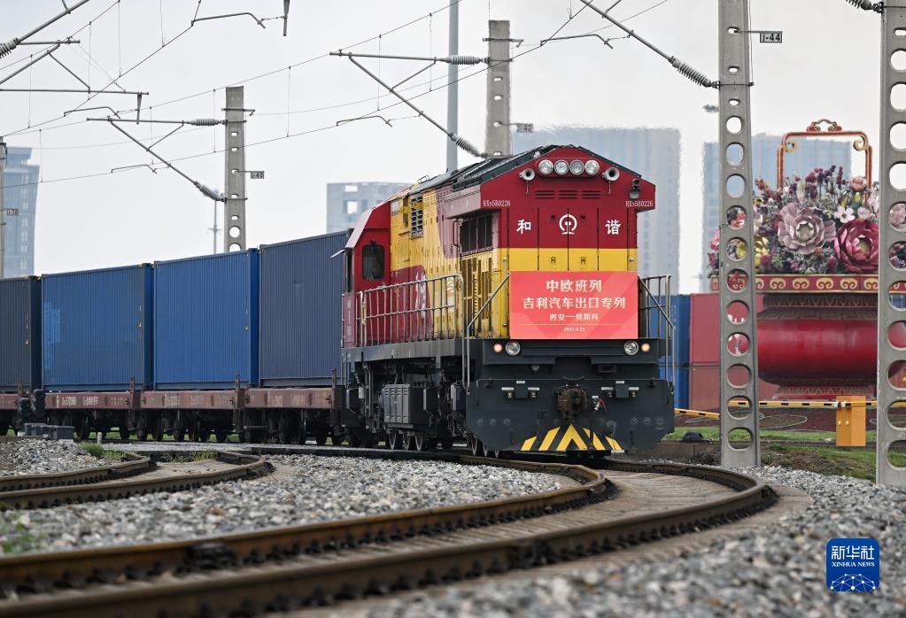 4月23日,中歐班列長(cháng)安號吉利汽車(chē)出口專(zhuān)列從西安國際港站駛出。