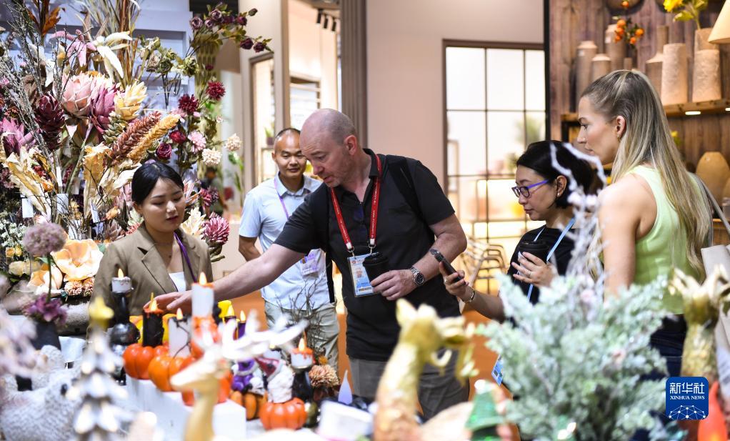 4月23日,采購商和參展商在家居飾品展區洽談。