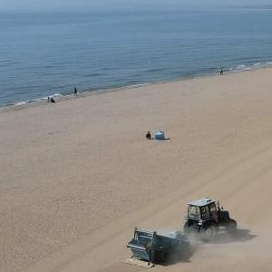 4月23日,工人在秦皇島市海港區金夢(mèng)海灣浴場(chǎng)使用機械設備過(guò)濾海灘上的沙子(無(wú)人機照片)。