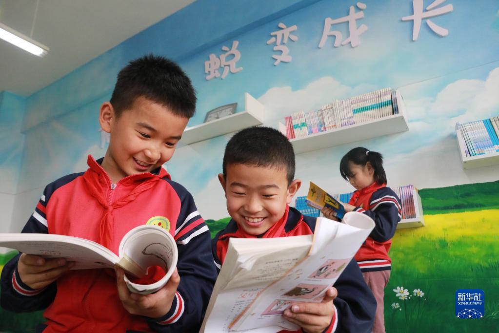 4月20日,山東省高密市崇實(shí)小學(xué)的學(xué)生在校園圖書(shū)角閱讀圖書(shū)。
