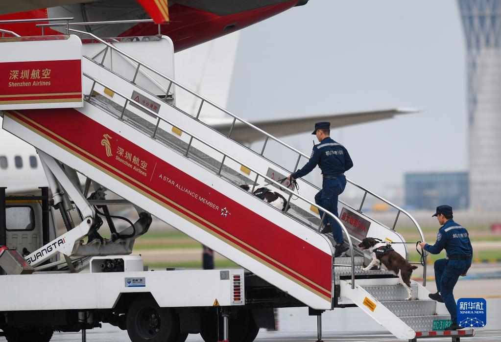 4月23日,在深圳機場(chǎng)舉行的演練中,警方對航空器進(jìn)行模擬搜排爆工作。