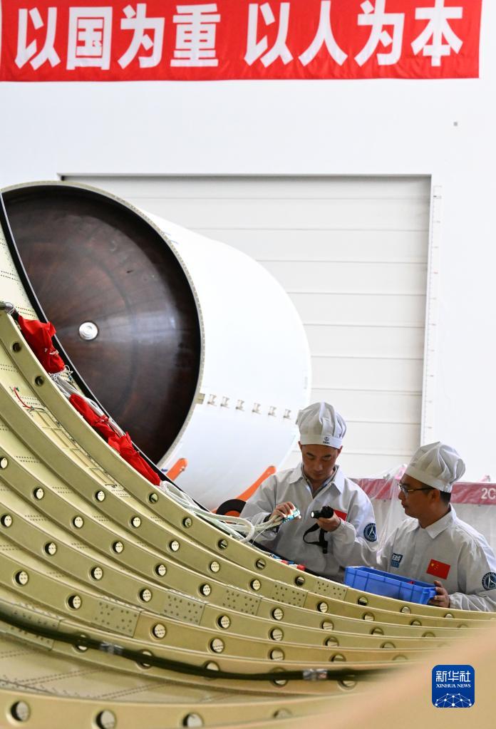 在航天科技集團一院天津火箭公司總裝測試車(chē)間,駱鑫生(左)與班組副組長(cháng)王海洋為火箭某部件裝配(4月19日攝)。