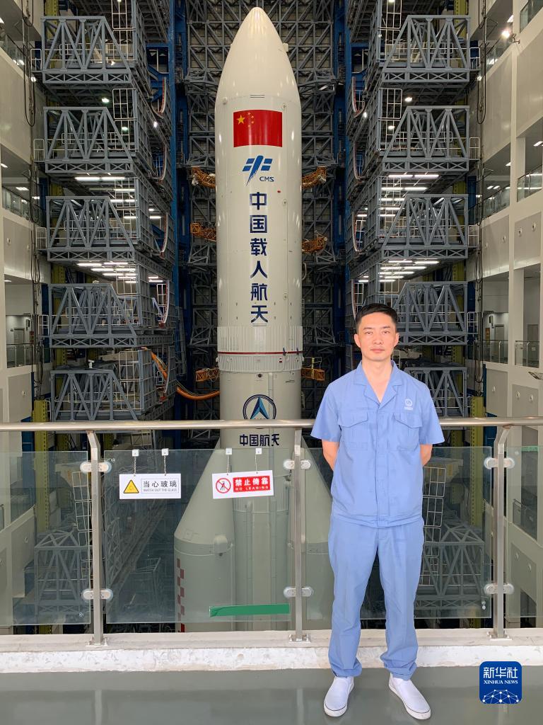 在參與長(cháng)征五號B遙二運載火箭發(fā)射任務(wù)期間,駱鑫生在海南文昌發(fā)射場(chǎng)與火箭合影(資料照片)。