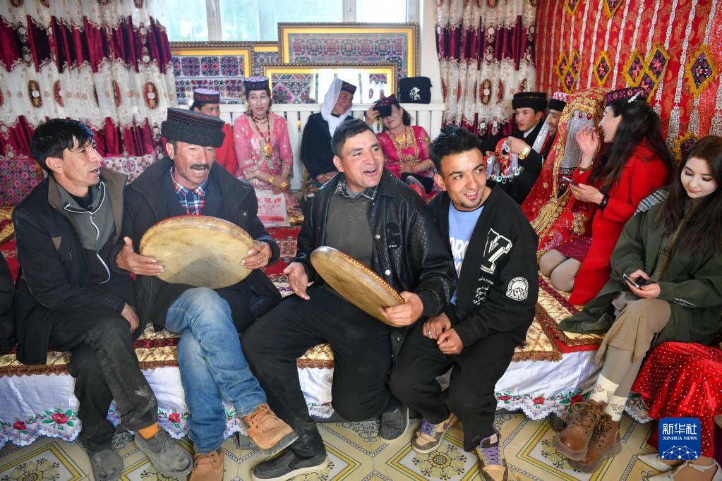 新疆塔什庫爾干塔吉克自治縣富民村,親友們在婚禮儀式上放聲高歌,為新人送上祝福(3月19日攝)。25歲的古麗汗·贊加比力和相戀三年多的買(mǎi)熱買(mǎi)提汗·青鐵木爾舉行婚禮,儀式按當地民俗傳統進(jìn)行,親友、村民載歌載舞,相聚慶賀。