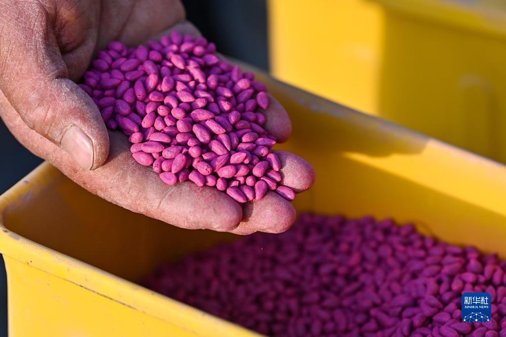新疆麥蓋提縣,棉農查看棉花種子(4月2日攝)。