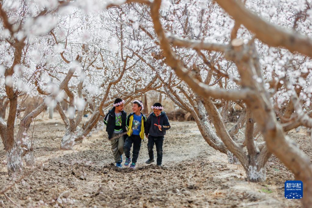 小朋友在新疆吐魯番杏花林中游玩(3月18日攝)。