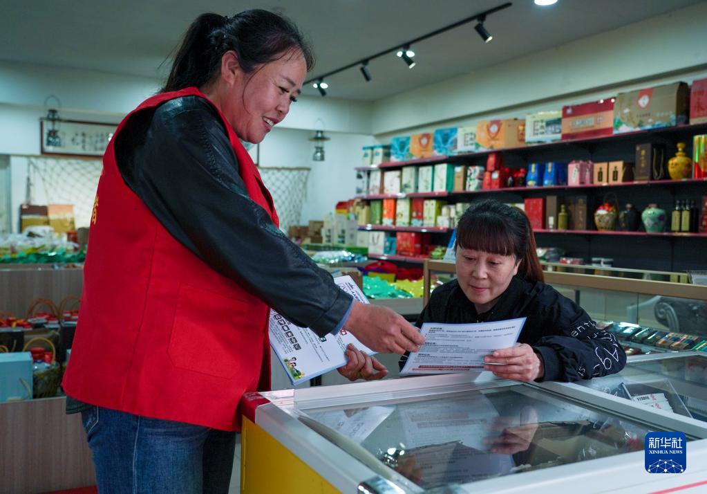 4月24日,在建德市梅城鎮古街一家商鋪內,志愿者在進(jìn)行亞運知識宣傳。