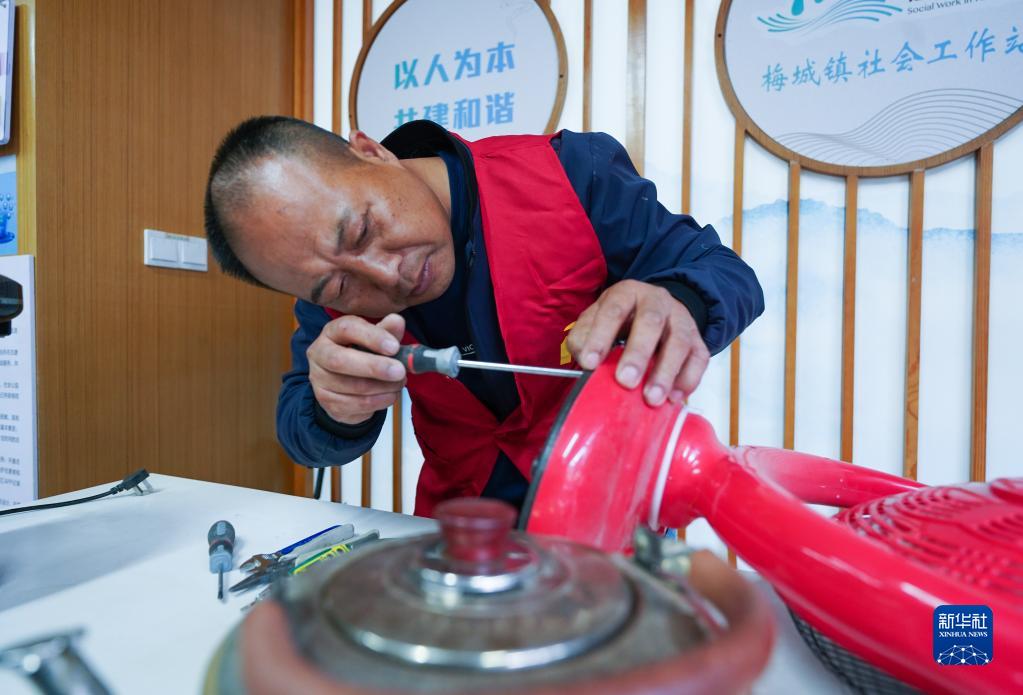 4月24日,在建德市梅城鎮古街,社區志愿者為居民提供修理電器服務(wù)。