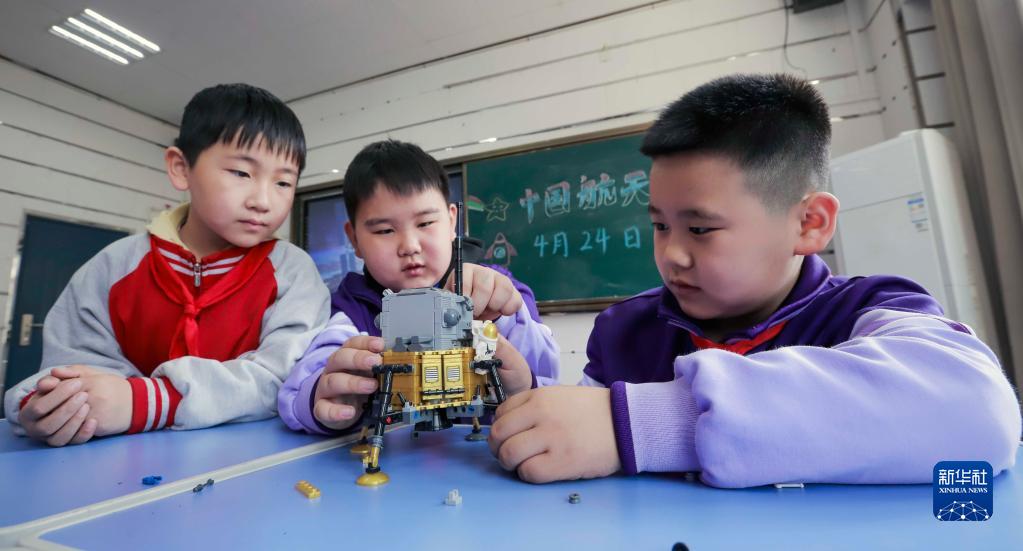 4月24日,河北省遵化市第二實(shí)驗小學(xué)的學(xué)生在組裝航天器模型。