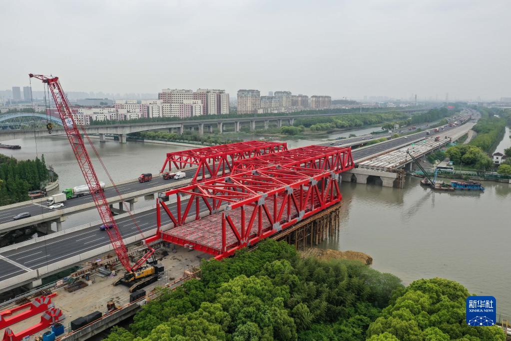 4月25日拍攝的滬寧高速公路青陽(yáng)港大橋南半幅鋼桁梁施工現場(chǎng)(無(wú)人機照片)。