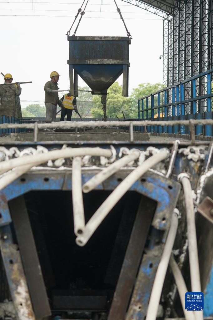 4月25日,中鐵二十局建設者在蘇臺高速公路七都至桃源段ST-QL5標預制梁場(chǎng)澆筑混凝土。