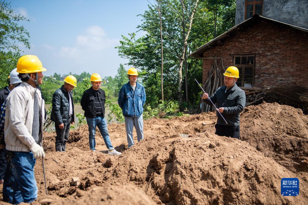 4月25日,在安全鄉恒豐村,技師(右一)向工人們介紹建筑材料。