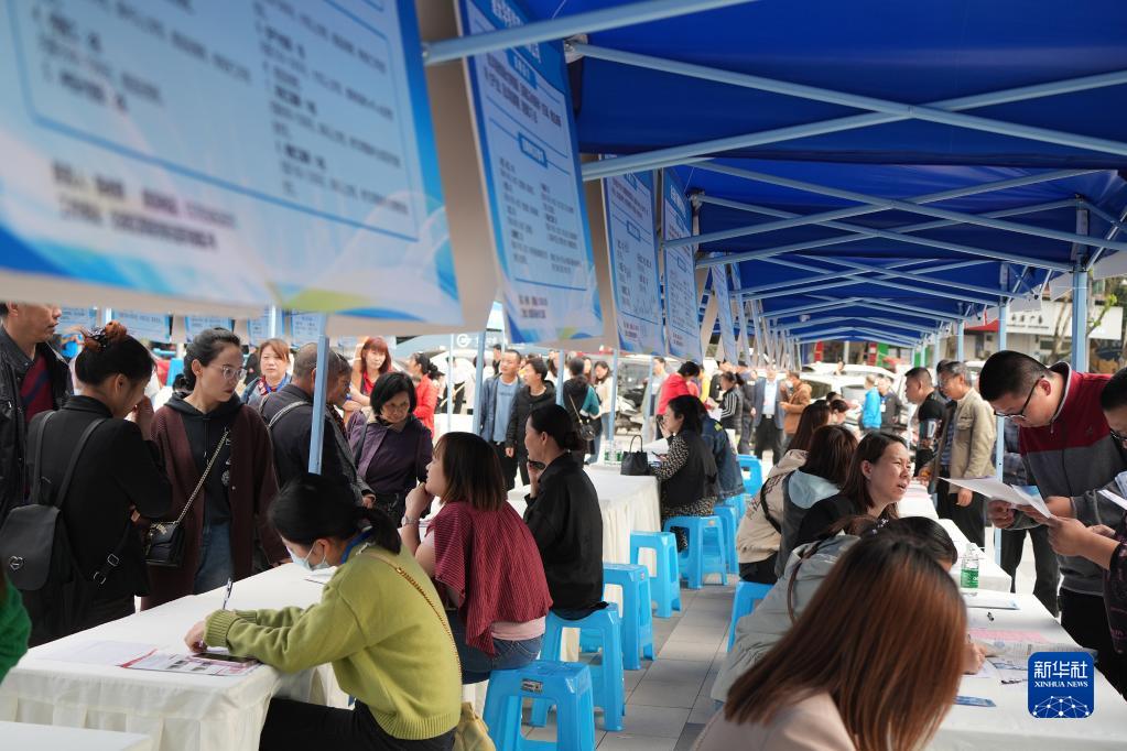 4月25日,求職者在重慶市北碚區吾悅廣場(chǎng)舉行的民營(yíng)企業(yè)服務(wù)月專(zhuān)場(chǎng)招聘會(huì )現場(chǎng)了解用工信息。