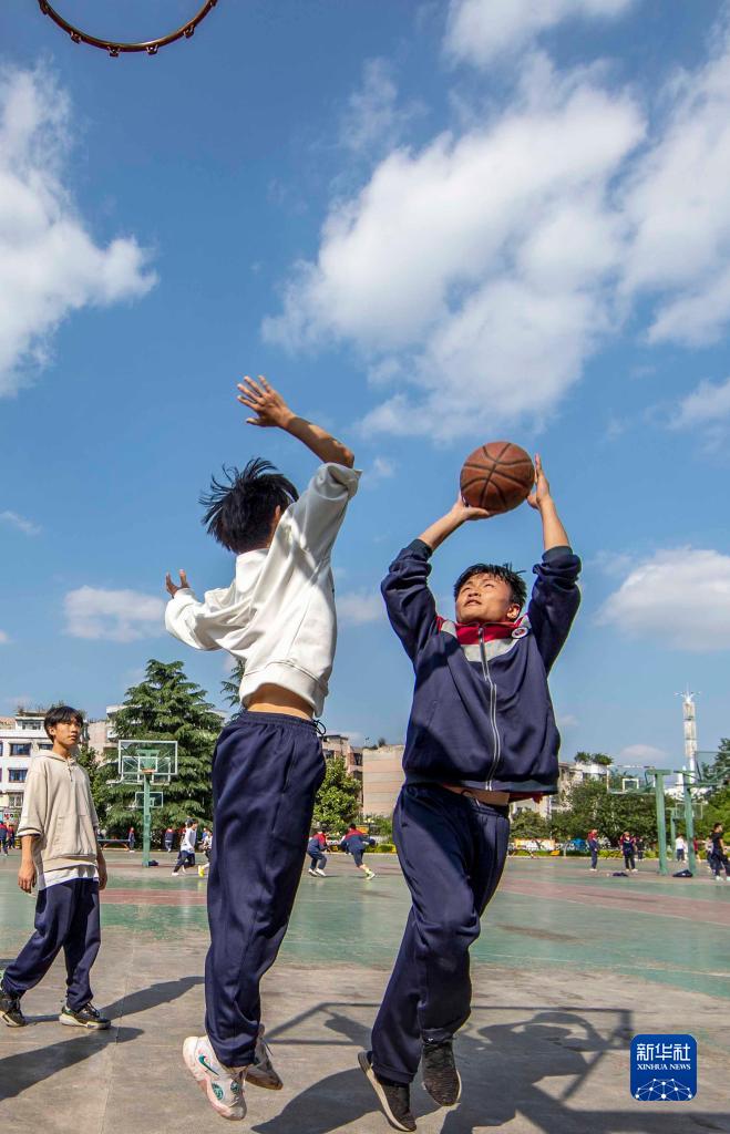 4月25日,在黔西第一中學(xué),學(xué)生在進(jìn)行籃球模塊分組練習。
