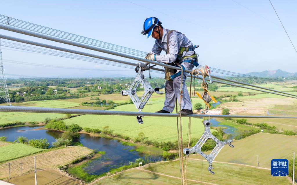 電力工人段信陽(yáng)在線(xiàn)路上作業(yè)(4月20日,無(wú)人機照片)。