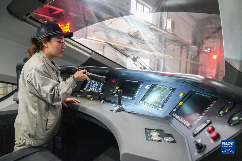 在哈爾濱動(dòng)車(chē)段整備庫,機械師丁偉桐在動(dòng)車(chē)組司機室檢查設備運行狀態(tài)(4月25日攝)。