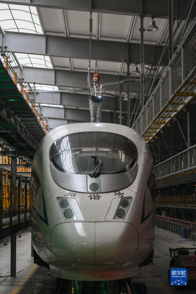 在哈爾濱動(dòng)車(chē)段整備庫,機械師康悅在動(dòng)車(chē)組車(chē)體頂部安裝安全繩鎖扣(4月25日攝)。