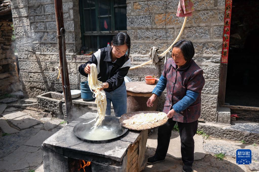 陳曉麗(左)在 “老趙農家樂(lè )”幫助村民桑風(fēng)英煮手搟面(4月18日攝)?!袄馅w農家樂(lè )”是村民趙長(cháng)根、桑風(fēng)英兩口子用自家房子開(kāi)的,主要做農家飯。新華社記者 張鋮 攝
